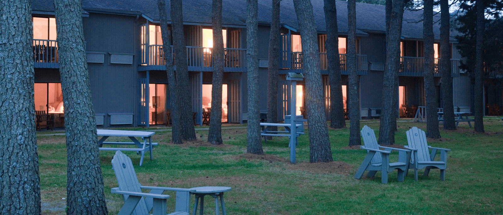 Folks ask us all the time which side of the Inn most people prefer, and to us it seems pretty split down the middle. The East Side faces the parking lot and the pony pasture, and you can sometimes see the lighthouse blinking in the distance through the pines. It's convenient for bicycles (just pull them to your patio) and gets wonderful sunlight in the morning. The West Side faces the pine trees, picnic area, and pool. It's typically a little quieter, a little darker (for the night owls) and is great for balcony birdwatching or wine sipping.