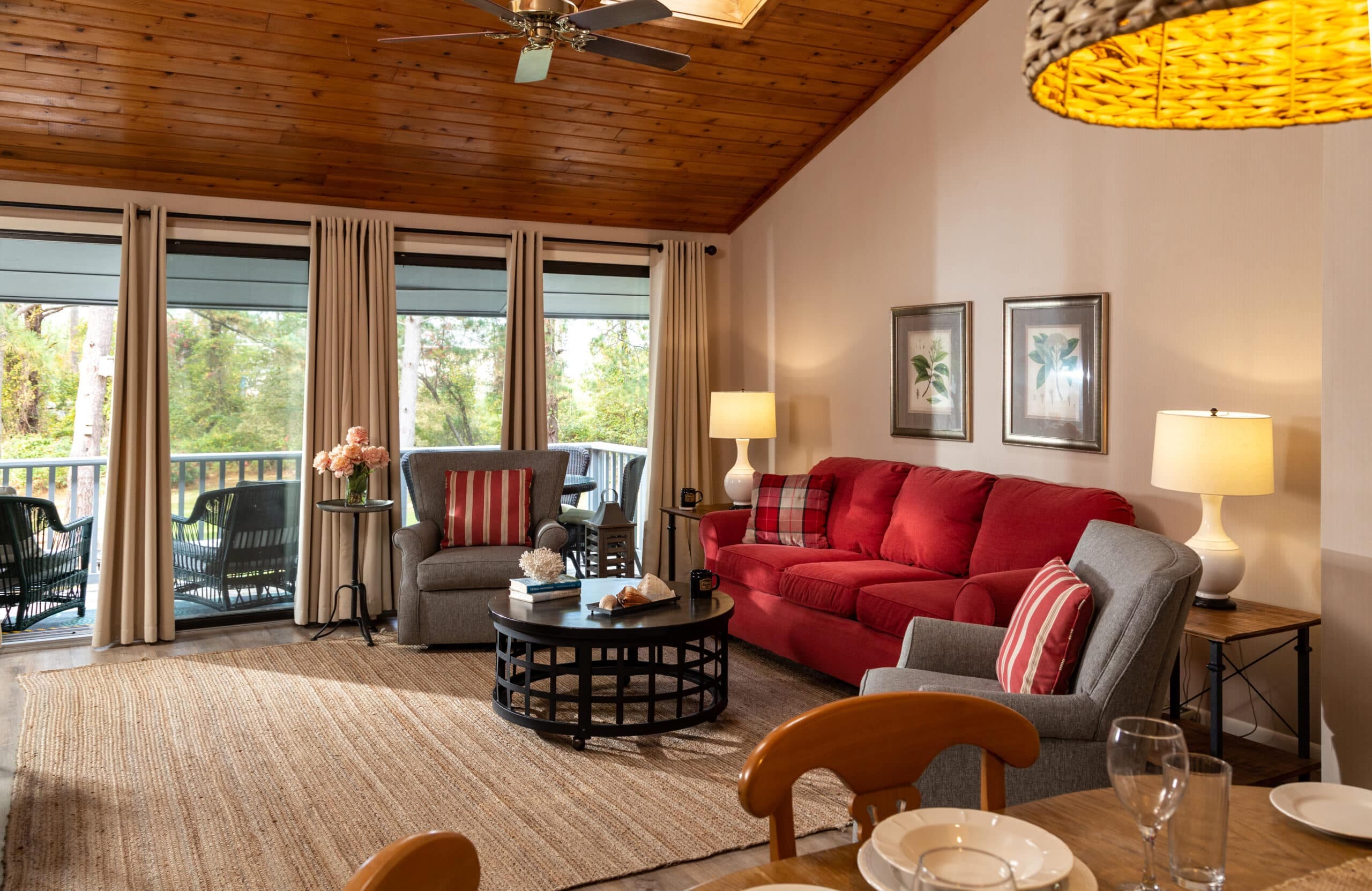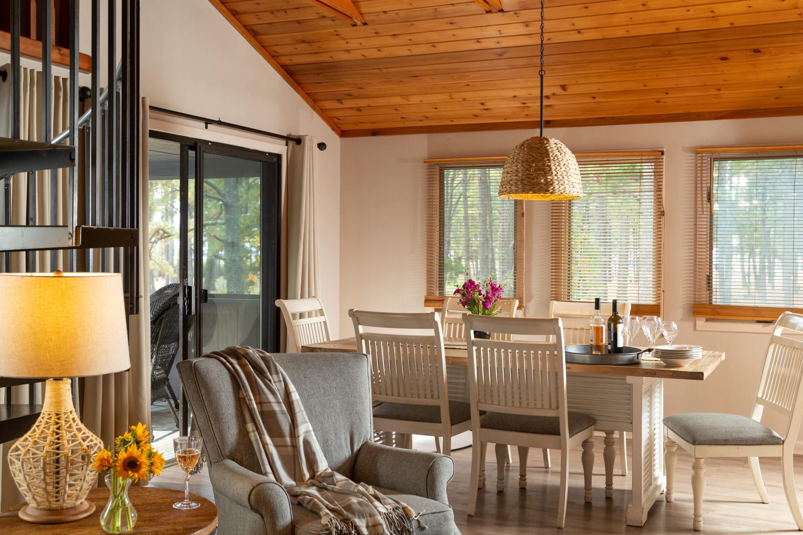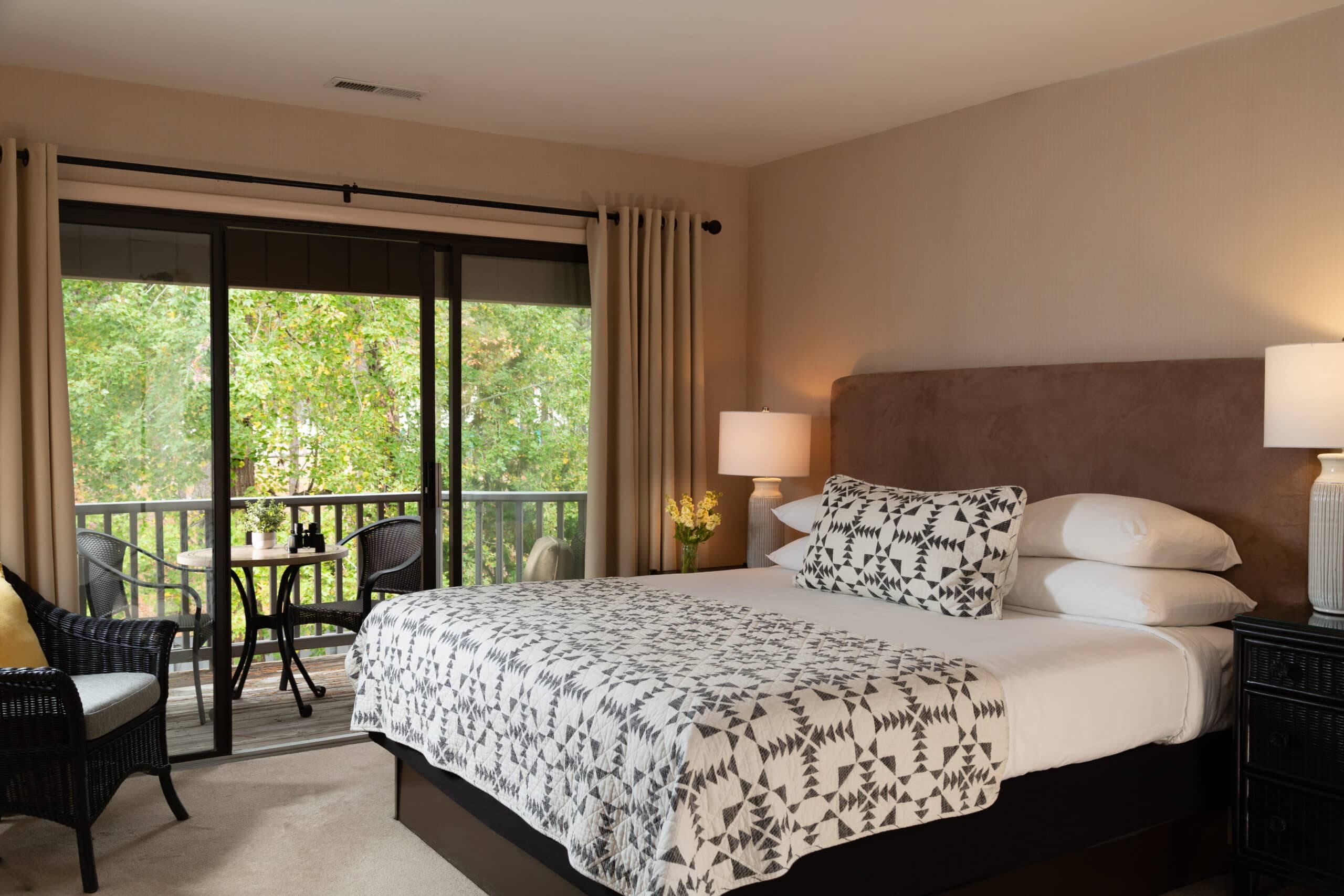 Some King rooms feature deep soaking tubs and Smart TVs (usually available upon request.) Upstairs rooms have a private balcony, while downstairs rooms have a patio. Some rooms overlook the pine trees, pool, and picnic area, while others overlook the pony pen and parking lot. Each room has two outside chairs, and sliding glass and screen doors provide easy access to the outside.