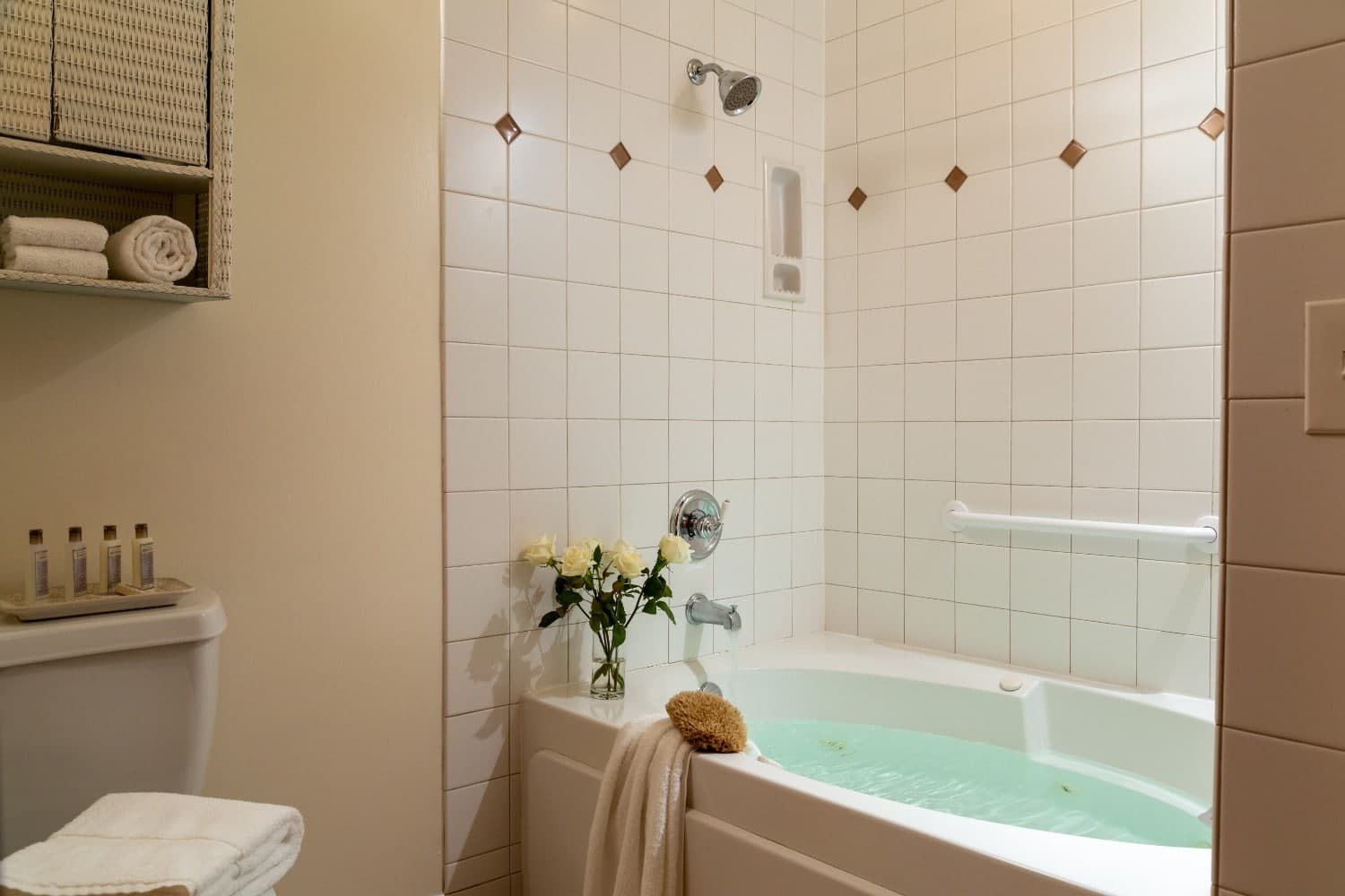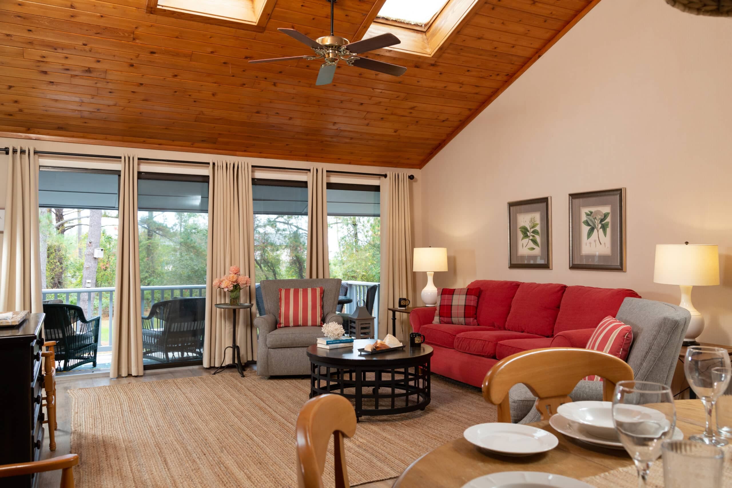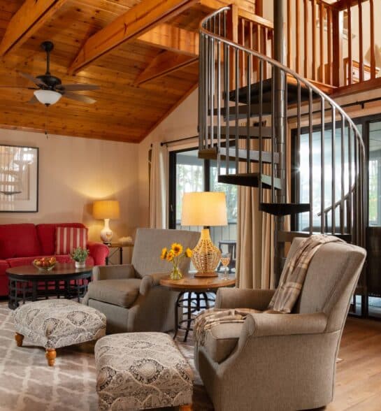 Some King rooms feature deep soaking tubs and Smart TVs (usually available upon request.) Upstairs rooms have a private balcony, while downstairs rooms have a patio. Some rooms overlook the pine trees, pool, and picnic area, while others overlook the pony pen and parking lot. Each room has two outside chairs, and sliding glass and screen doors provide easy access to the outside.