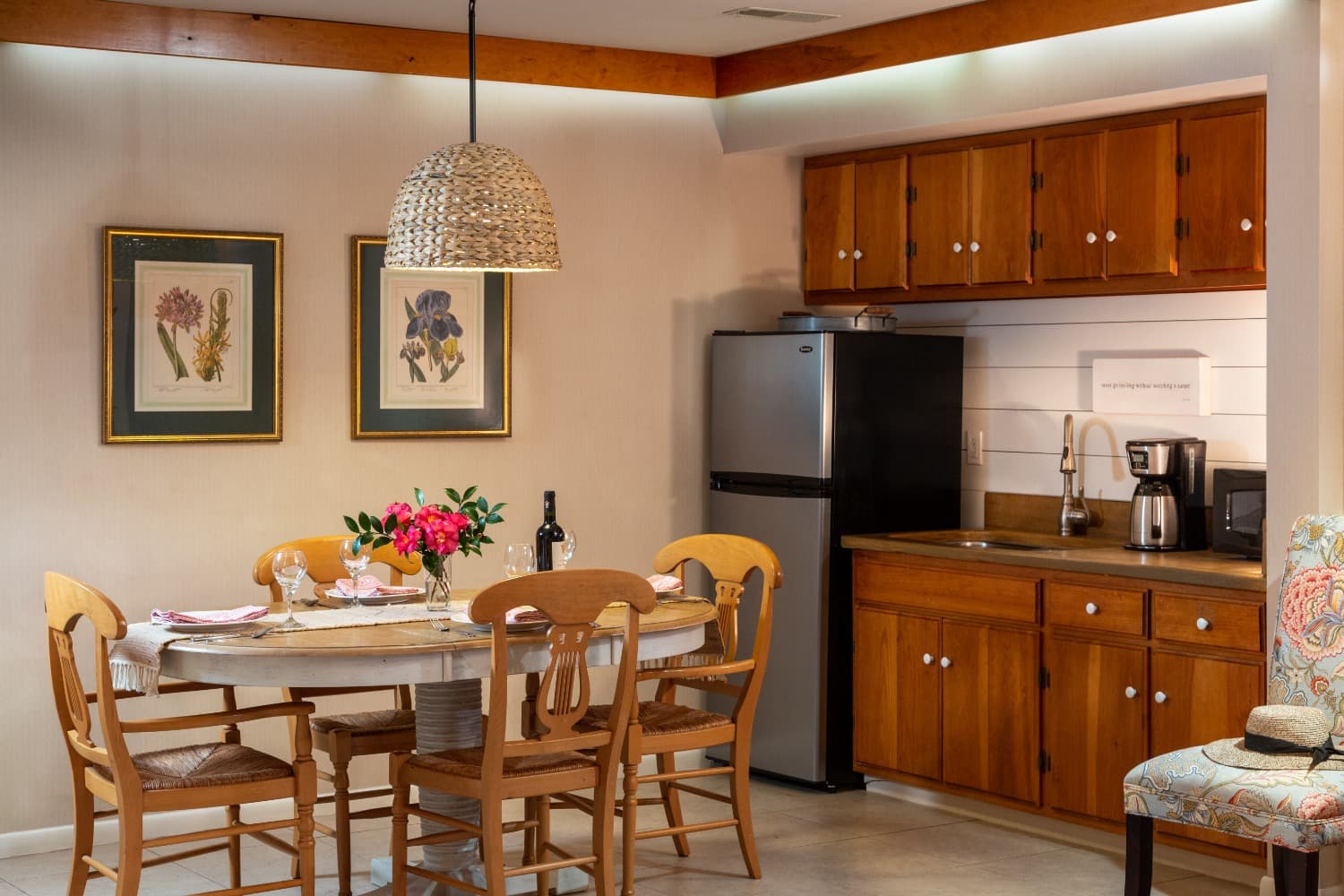 Each of our rooms are decorated differently, but they all include a table with two deluxe chairs, flatscreen TV, USB charging station, coffeemaker, mini fridge, hair dryer, and clock radio.